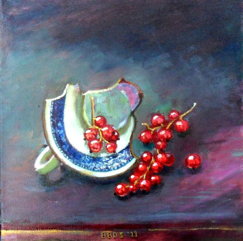 Stilleven Potscherf met aalbessen, 2013, kopie op linnen, 20x20, ingelijst in zwarte baklijst. € 35 euro incl. verzending. Toch leuk cadeautje.
