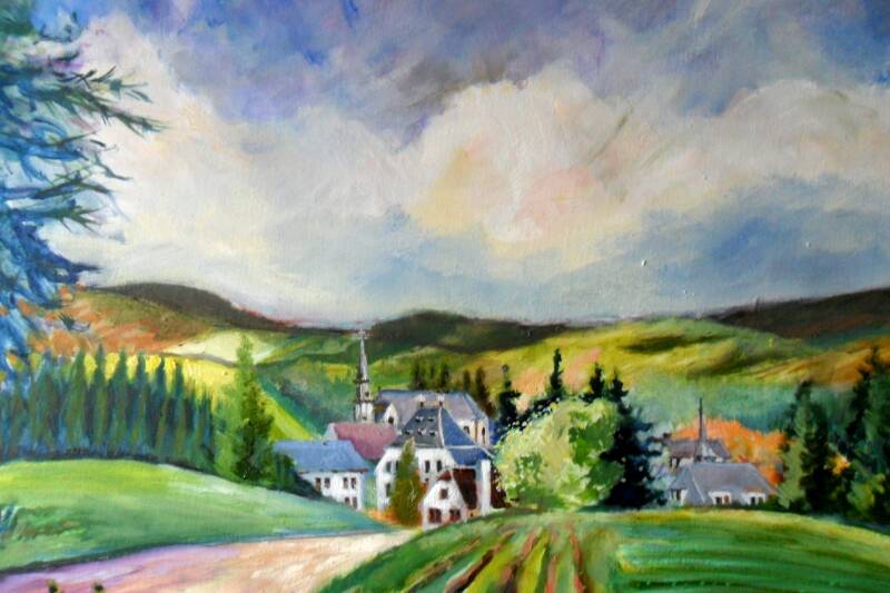 Van het land. Het land geeft gras. De koe eet gras en de koe geeft melk. Hieronder het kleine schilderijtje: Iets voor de keuken of gangetje naar de schuur.